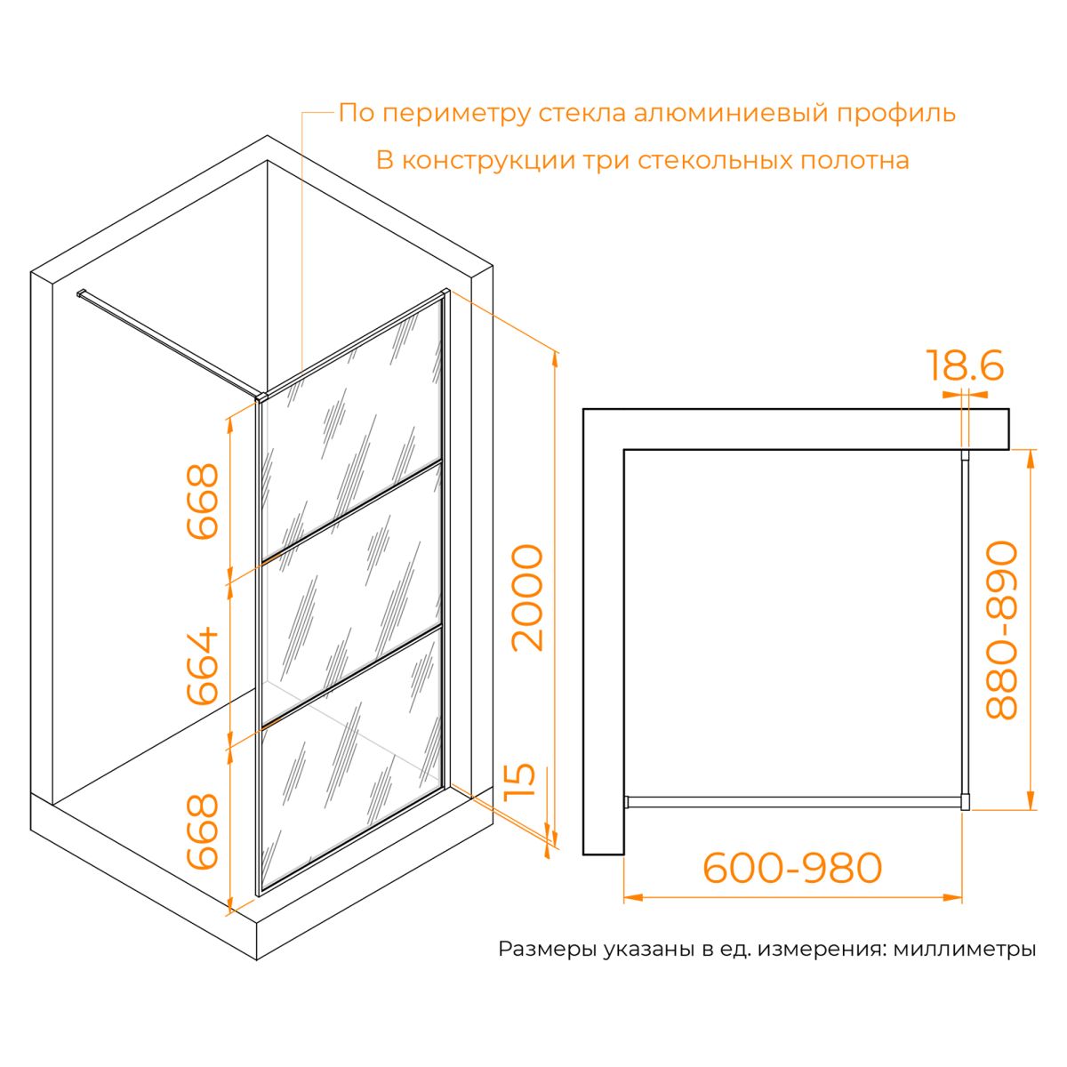 Душевая перегородка состоит из 3-х стекольных полотен (8мм), которые обрамлены изящным анодированным алюминиевым профилем!