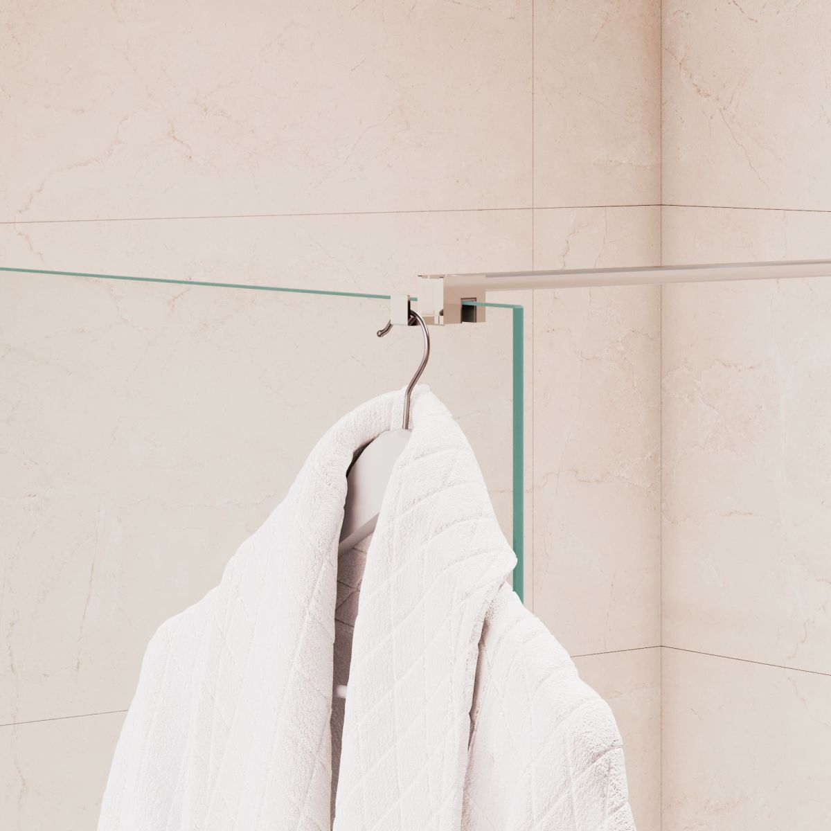 Душевая перегородка из стекла на профиле к стене бескаркасного типа с открытым входом в душ RGW WA-210 и вешалкой крючкообразного типа — Это современное решение в душе, позволяющее эффективно использовать штангу-держатель стекла как вешалку для полотенца или халата, при этом оно не только эффективно зонирует пространство, защищая остальную часть санузла от брызг, но и визуально расширяет вашу ванную комнату, наполняя ее светом и простором.