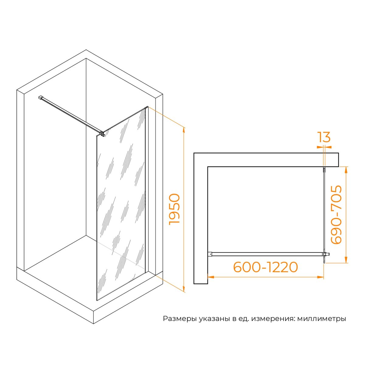 Стеклянная душевая перегородка с крючком высотой 1950 мм эффективна при установке на подиум для людей с высоким ростом, может также установиться на пол с плоским душевым поддоном или без дополнительной основы, на керамическую плитку с душевым трапом.