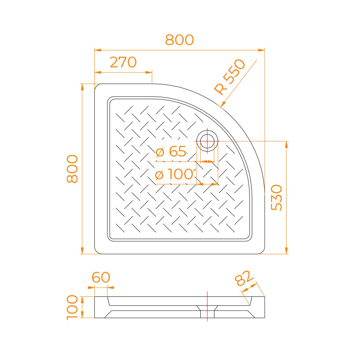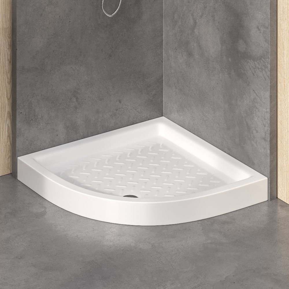 Поддон для душа белого цвета, полукруглый (четверть круга) из санфарфора с уклоном под слив. Представляет собой единую плиту с бортиками из высококачественной керамики с отверстием для сифона.