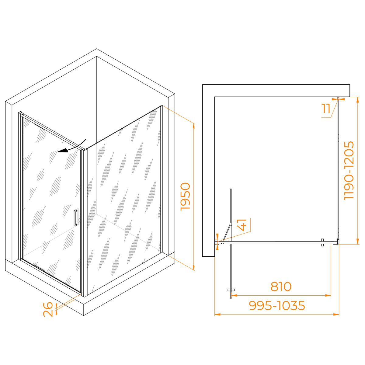 Душевая дверь для ниши роторная при установке образует квадратную либо прямоугольную душевую зону.