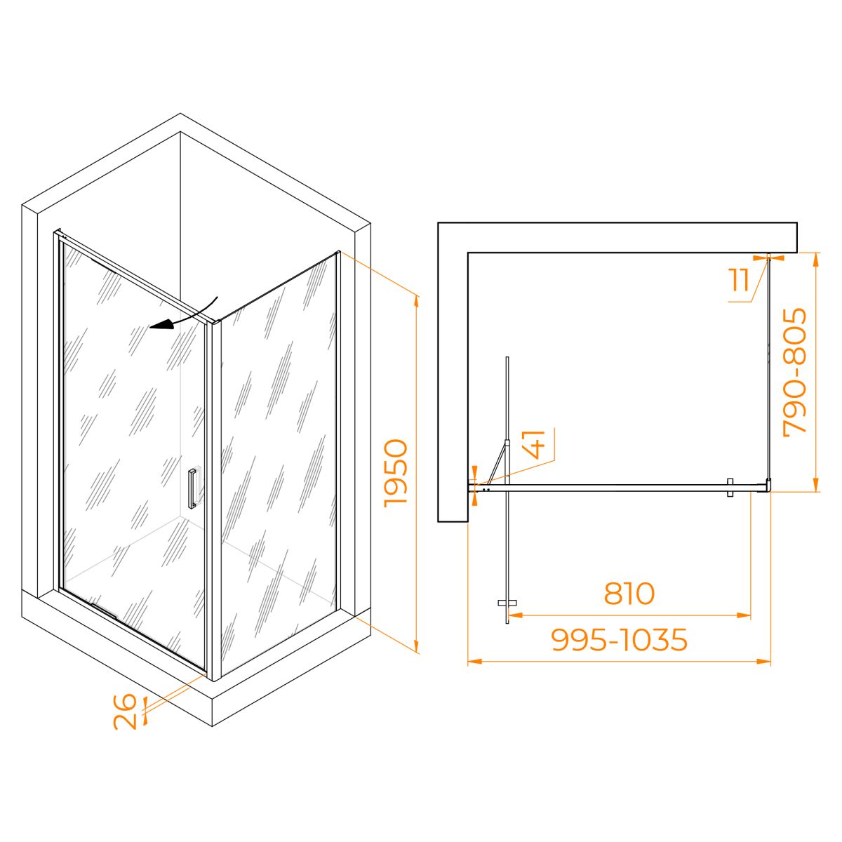 Душевая дверь для ниши роторная при установке образует квадратную либо прямоугольную душевую зону.