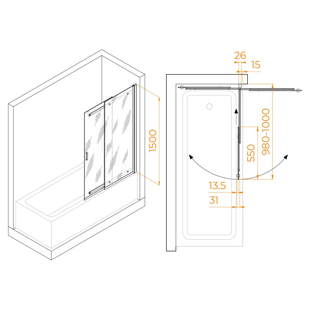 Высота стеклянной шторки составляет 1500 мм, что вполне достаточно для большинства ванных комнат. Ресурс эксплуатации составляет 15 лет, что гарантирует долгий период бесперебойной работы шторки.