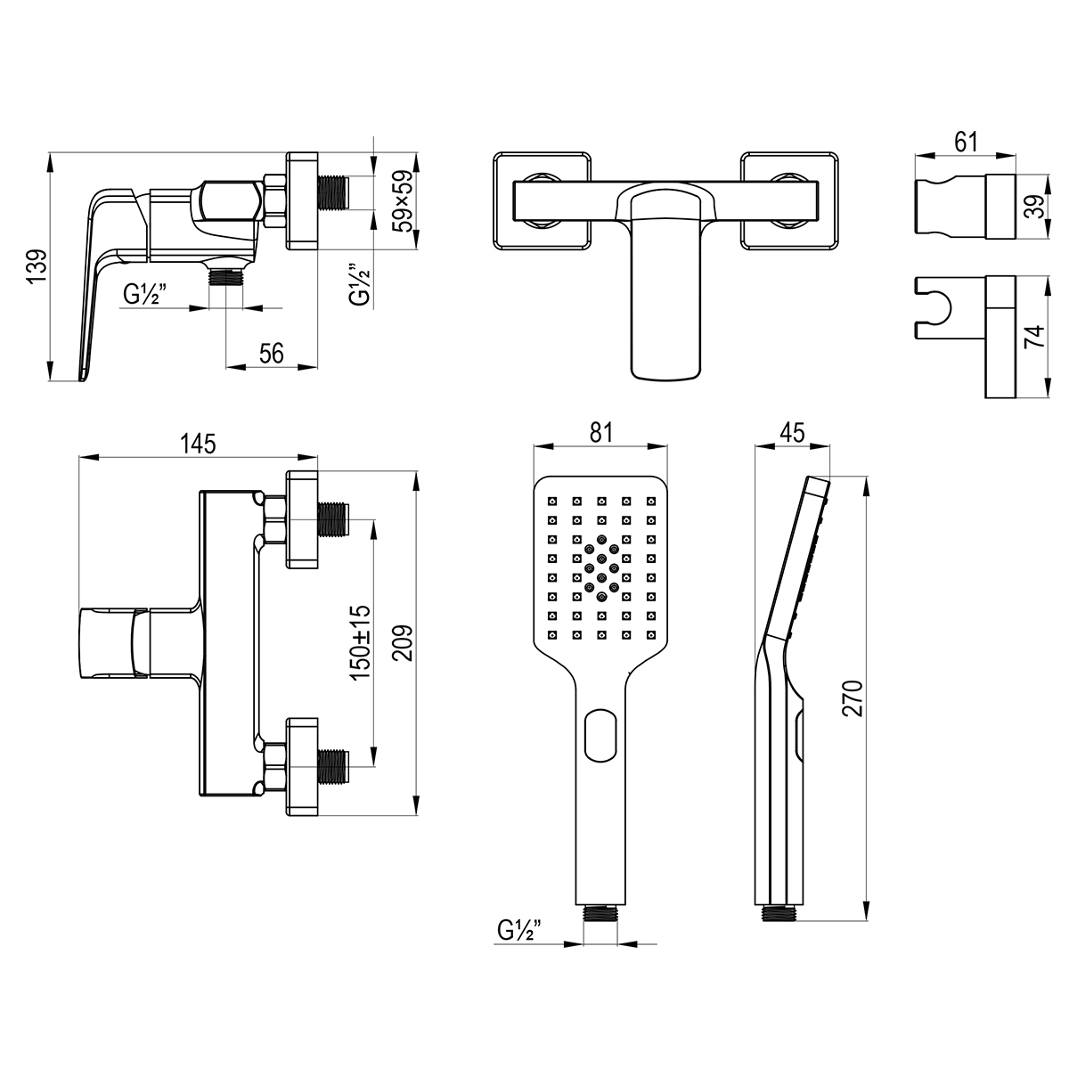 - Аксессуары в комплекте (3-функциональная лейка 270×80 мм, настенное крепление для лейки, душевой шланг 1,5 м)