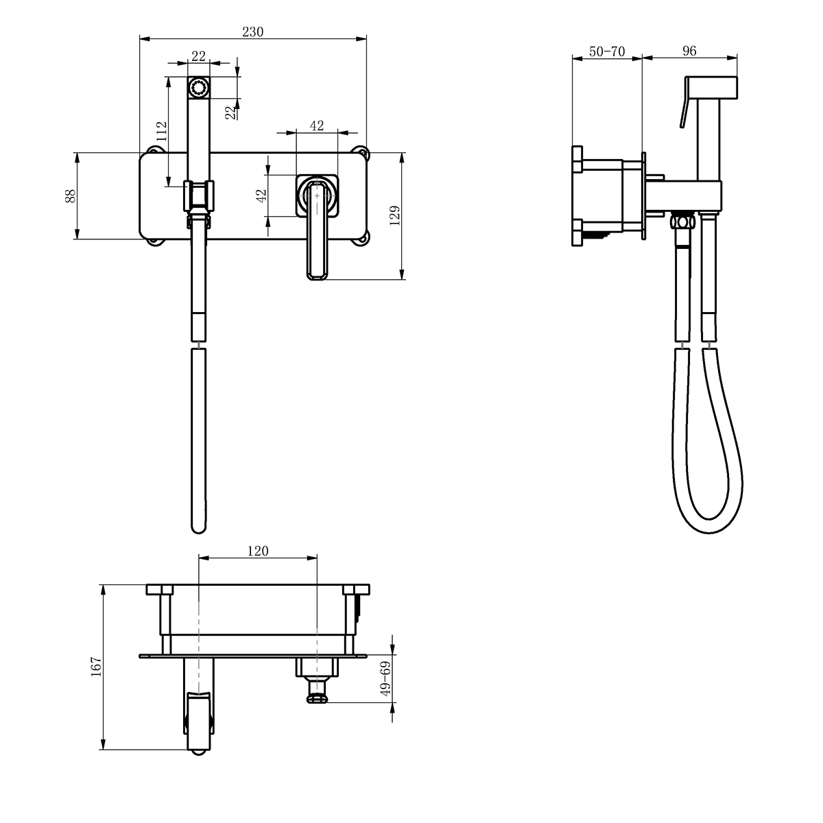 - Аксессуары в комплекте: лейка для биде с нажимным механизмом, шланг 1,2 м