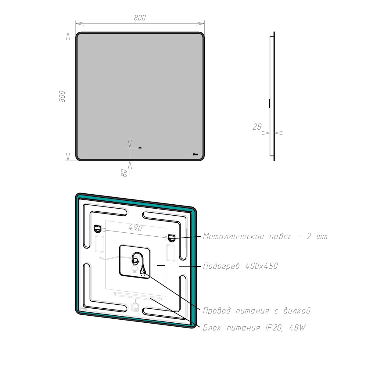 Зеркало Lemark MIOBLACK 80х80 см с интерьерной подсветкой, с подогревом